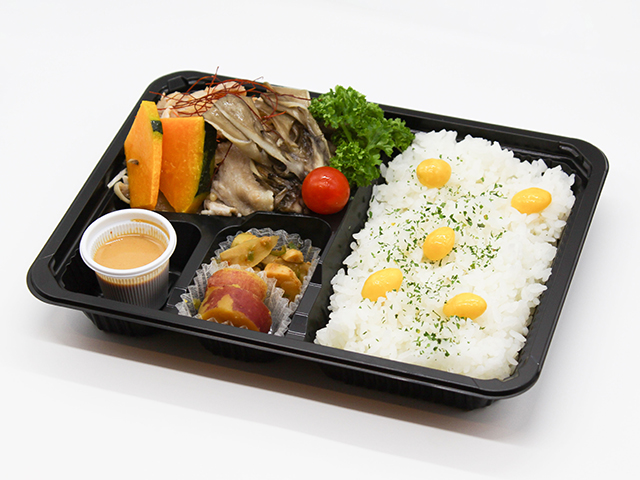 豚バラとえのき、玉ねぎを香ばしく焼き上げた主菜に、銀杏のほろ苦さ。かぼちゃの甘み、きのこの香りが寄り添う、季節の味わいを詰めたお弁当。