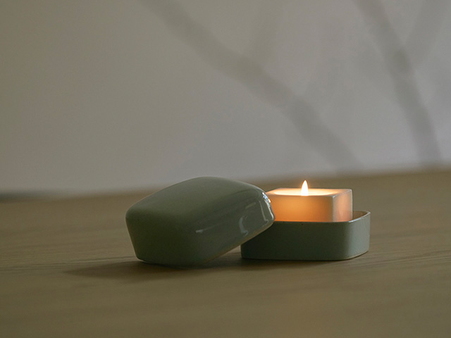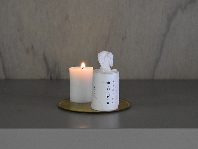 回収した「フレグランスキャンドル」や「フレグランスバー」を溶かして混ぜて作り直したキャンドルは、どの香りがどんな配合で混ざりあうかはタイミング次第。その時にしか出会えない、世界で一つの香りが生まれます。「フレグランスキャンドル」の器やお手持ちのお皿などに置いてお楽しみください。