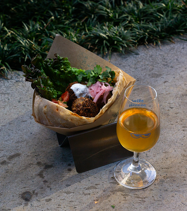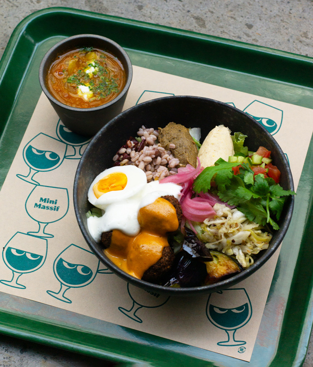 ひよこ豆のペーストをハーブなどで和えて揚げたファラフェルをベースに、自家製ソースをいくつも合わせたサラダボウル。