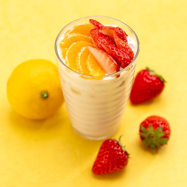 「紅ほっぺ」と」「はるひ」のほうじ茶ラテ