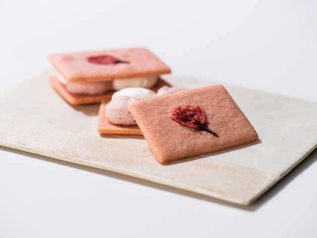 バタークリームと桜クリームを、桜の花の塩漬けをトッピングしたタルト生地でサンドしました。