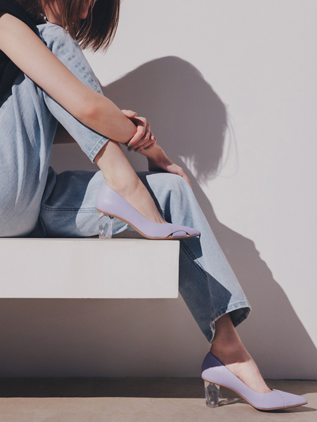 今シーズンおすすめのライラックカラーと、香水瓶をイメージさせるダイヤカットのヒールが印象的なパンプス。