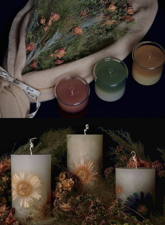 「meltcandle(メルトキャンドル)」より、草花を丁寧に染め重ねたキャンドルや、透明感と色彩のグラデーションが魅力のグラスジェルキャンドルが揃います。
