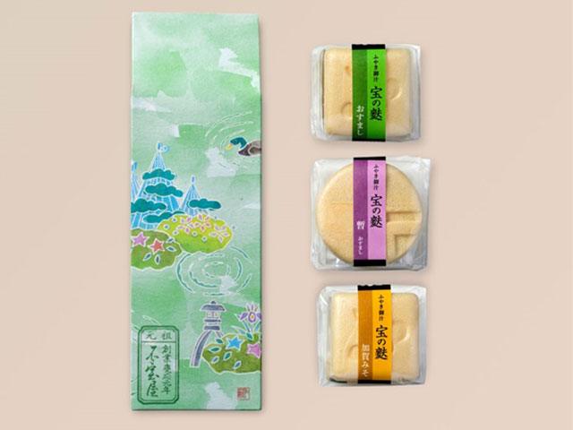 「宝の麩」定番のおすましと味噌汁を、『加賀友禅』の技法で描いた愛らしい小箱に詰め合わせました。