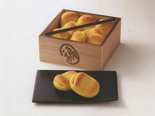 縁起の良いお多福豆の形の桃山製白あん入り焼菓子。