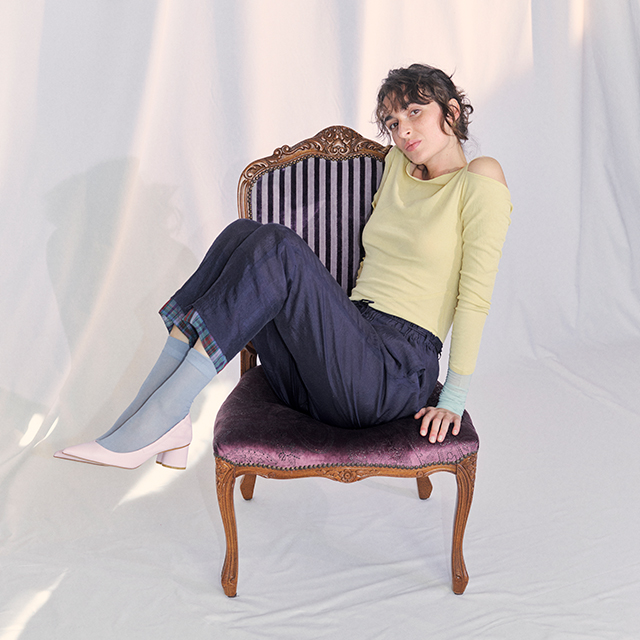 爽やかなイエローグリーンのトップスに、軽やかな素材感のパンツを合わせた、春らしい抜け感コーディネート。
