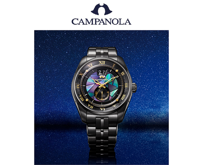 螺鈿細工のきらめきが誘う、ブラック×ゴールドの優美なハーモニー「星響」。漆黒の宙で響きあう星を表現したカンパノラ25周年記念モデルです。