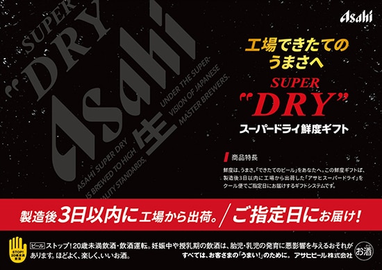 鮮度ギフトキットは、製造後3日以内に工場から出荷した「アサヒスーパードライ」を先様のご指定日にお届けするギフトシステムです。