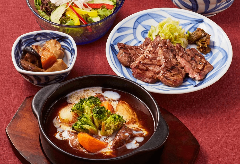 自慢のタレで味付けしたお肉を、「麦飯」「とろろ」「テールスープ」とご一緒にどうぞ。