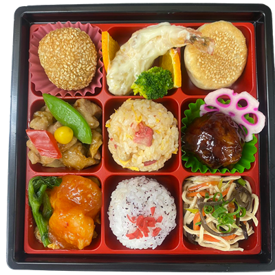 2種類のご飯と、7種類の中華惣菜を詰め合わせた彩り豊かな弁当です。