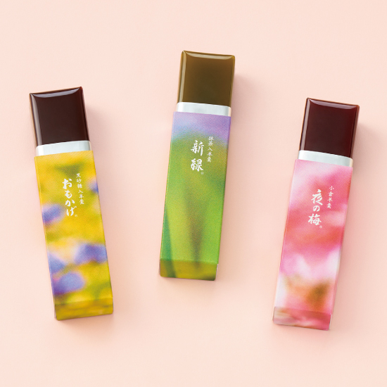 とらやを代表する小倉羊羹「夜の梅」、黒砂糖入「おもかげ」、抹茶入「新緑」を、やわらかな日差しに草花が芽吹く春を感じさせるデザインでご用意いたしました。