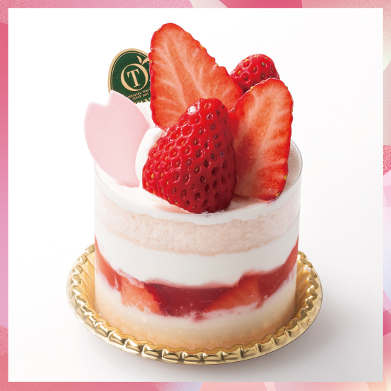 さくら風味のスポンジでアングレーズムース、苺、サクラソース、ホイップクリームをサンドしたケーキ。