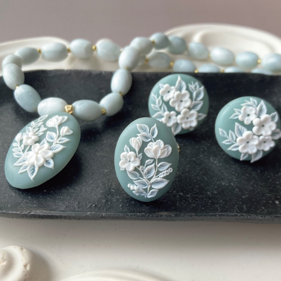 白く浮かび上がる植物柄は、職人がひと針ひと針手仕事で描いた繊細なレリーフ細工。陰影が生み出す静謐な美しさが目を惹きます。下書きや型を使用しない独自技術による一点物です。