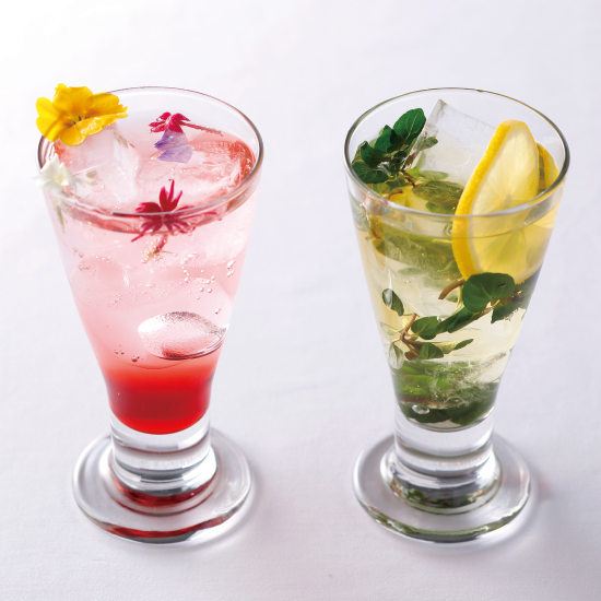 ハイビスカスとローズヒップの甘酸っぱいシロップをソーダで割った「ハイビスカスとローズヒップのソーダ」と、ジャスミンティーにミントとレモンを合わせた爽やかな「ジャスミンのモヒート」をご提供。