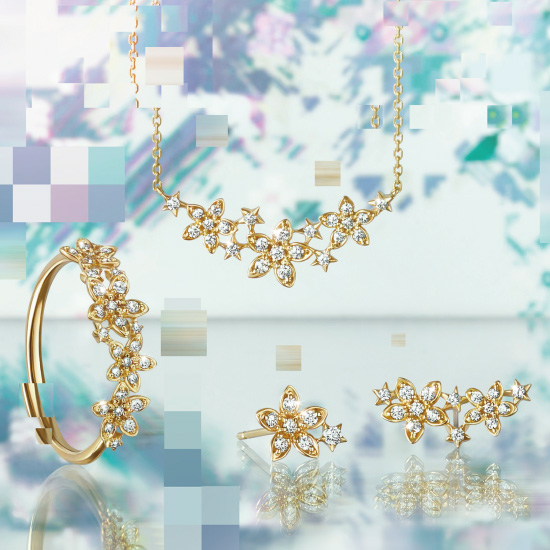 まるで小さな星が集まって咲いたような“ブルースター”の花をモチーフにしたシリーズ。星のブーケのように咲く花々が連なり、未来への兆しを重ねた自然を感じるデザインは、繊細ながらも華やかなコーディネイトを叶えてくれます。上品にセッティングされたダイヤモンドの輝きが目を引くデザインです。
