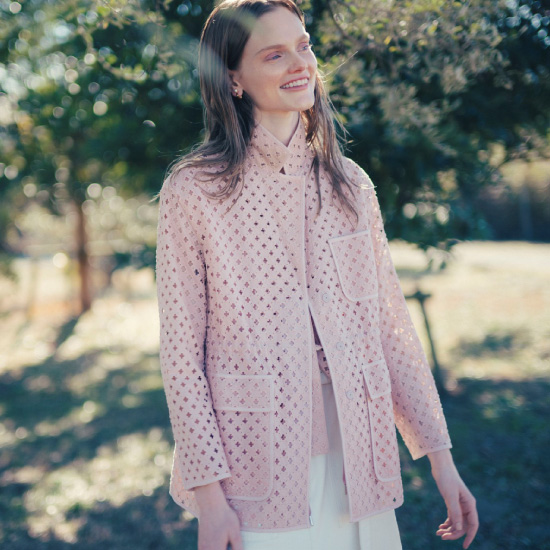 肌触りの良いコットンローンを下地にホールの大きいアイレット柄刺繍を施したジャケット。ぷっくりとした立体的な刺繍が魅力の一着です。