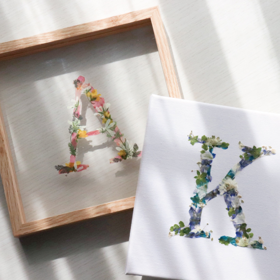 役目を終えた華や規格外のロスフラワーを使用し、お好きなイニシャルをモチーフにした押し花アートを制作していただきます。