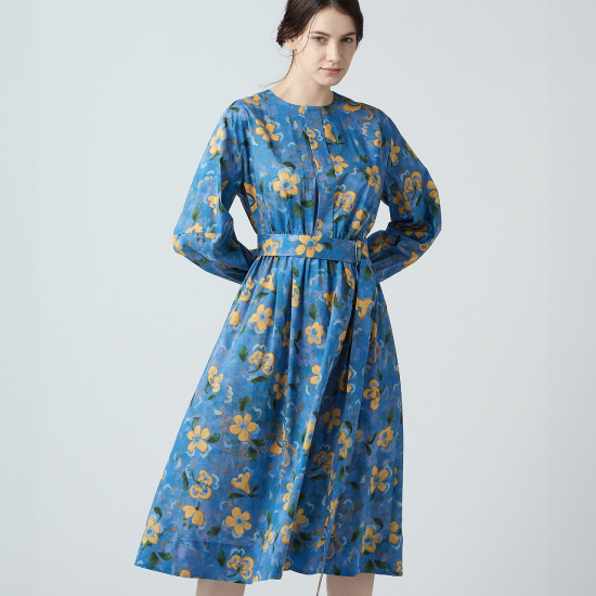 鮮やかなブルー、流れるような大胆なリバティープリントワンピース。ジャケットやカーディガンとのコーディネートでより華やかに。