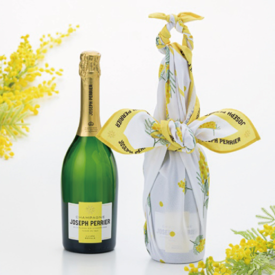 [ジョセフペリエ]を代表するフレッシュで爽やかなシャンパンとかわいいミモザ柄の風呂敷を合わせたセット。