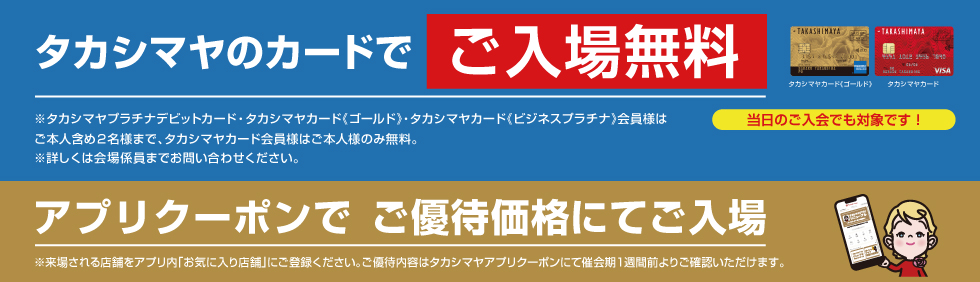 ご入場当日、タカシマヤの各種ご優待カード等と予約受付画面を会場入口にてご提示ください。ご優待カード等のご提示がない場合はご入場できません。