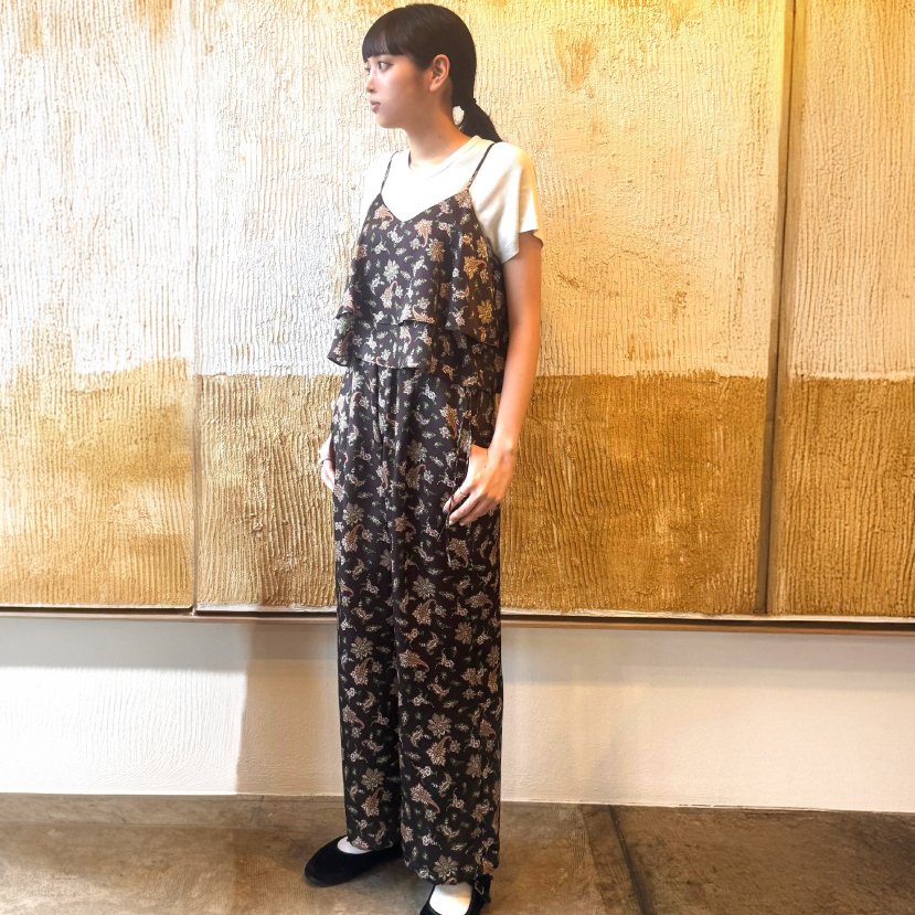 前後どちらも楽しめる2wayデザインのビスチェとリラクシーでフェミニンなパンツ。セットでコンビネゾンのように着ていただくのもとても素敵です。ブラウンを基調とした柔らかい色合いで軽やかに。