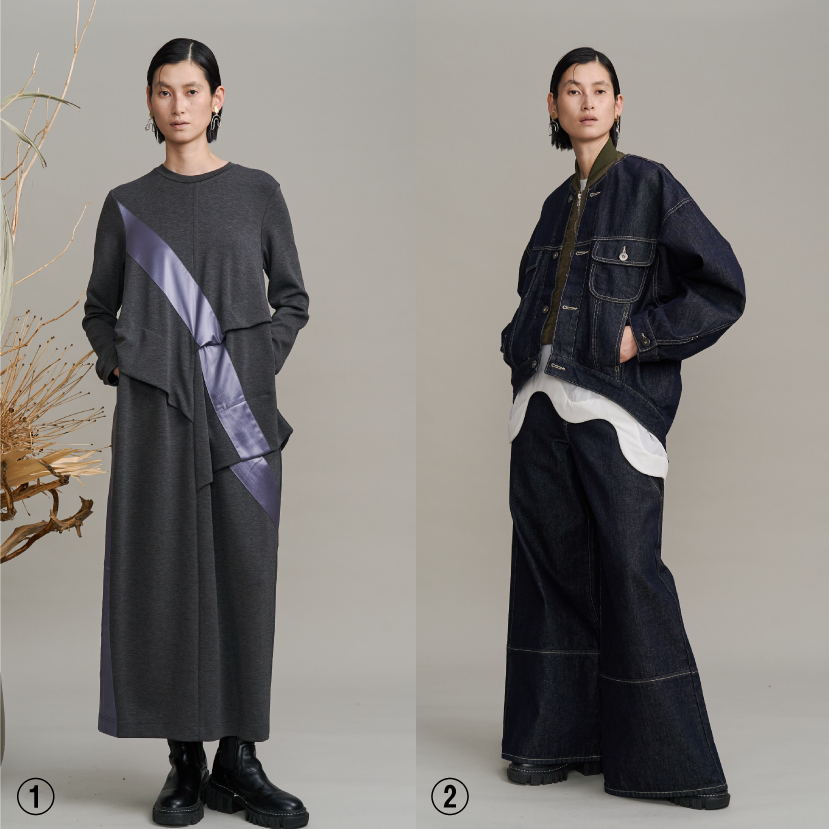 ①レザーライクなサテン生地のラインが入ったジャージーワンピース。身頃部分にアシンメトリーにタックを入れ、構築的な印象に。
