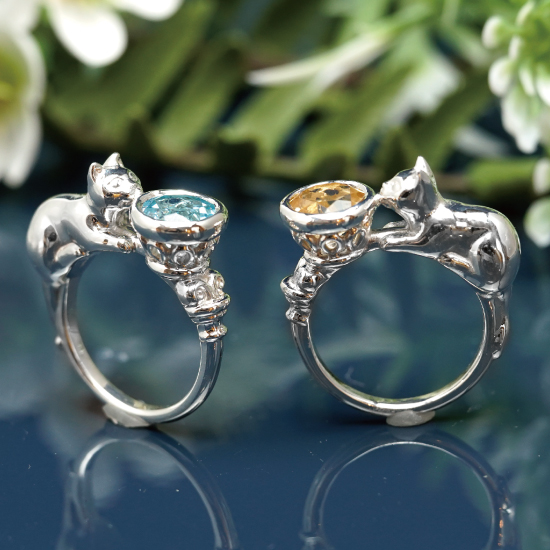 シルバーと天然石の本格ジュエリーでありながら猫を可愛らしくつけやすくデザインしています。