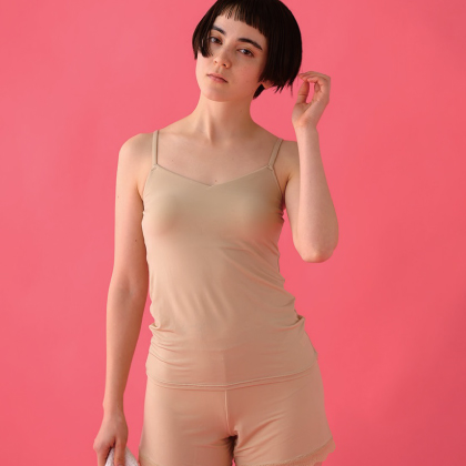 綿糸として使わないうぶ毛部分(コットンリンター)をピュアな再生繊維に。ポリウレタンの一部に工場内のリサイクル糸を使用したランジェリーです。