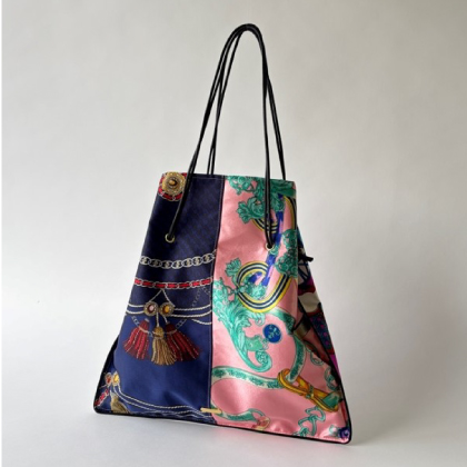 スカーフをリメイクし、パッチワークした3WAYバッグ。持ち方をアレンジできるだけでなく、軽くて持ちやすいのも魅力的な一点ものです。