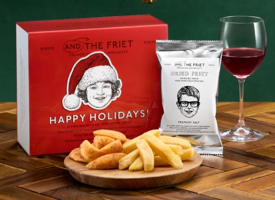 人気のメッセージ付きスリーブに、サンタ帽をかぶった女の子のイラストが可愛らしいクリスマス限定バージョンが登場!6種類のドライフリットを詰め合わせたボックスは、食べ比べを楽しむことができます。