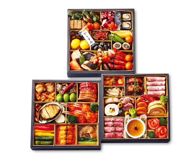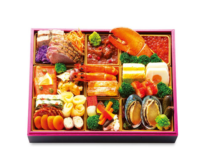 黒豆や煮物など定番の和風献立に、オマール海老のパイ包み、鮑のオイスターソース煮、海老チリソースなど、洋風と中華を組み合わせました。