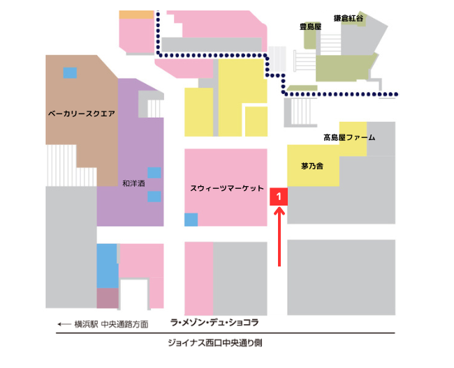 [鎌倉紅谷]のお品物をご希望で、開店前にお並びいただくお客様は、地1階Foodies' Port2の下図 1 にお越しいただきますよう、お願い申しあげます。