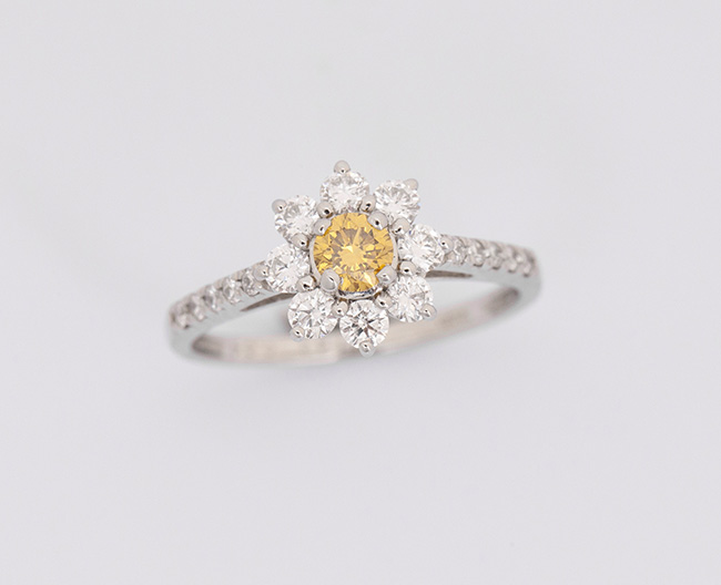 (中石:0.242ct、FVY(ファンシービビッドイエロー)-Sl2 、脇石:計0.54ct 鑑定書付)