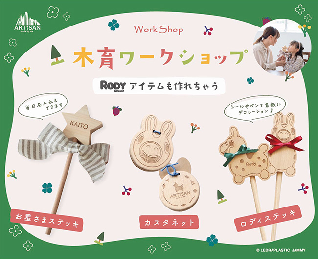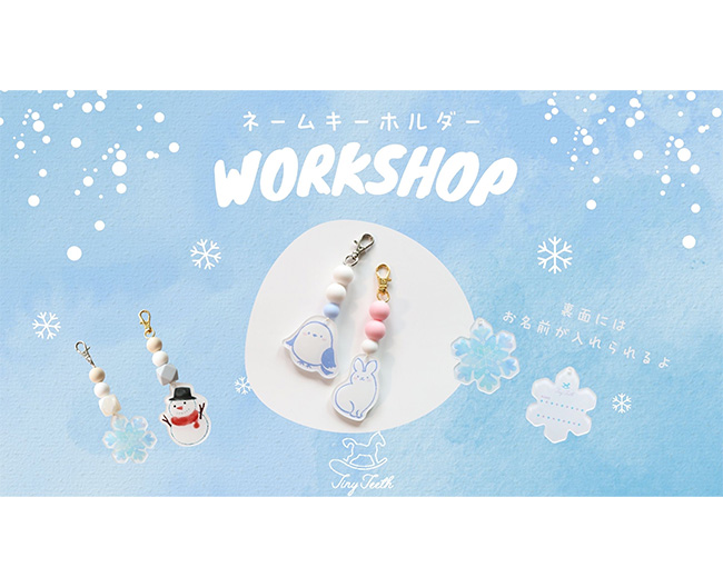ネームキーホルダーをお選びいただき、お好きな色のシリコンビーズを組み合わせて完成させる「TinyTeethネームキーホルダー」やレーザー彫刻でお名前や好きな言葉を刻印できる「Artisan木育ワークショップ」の2種類をご⽤意しております。