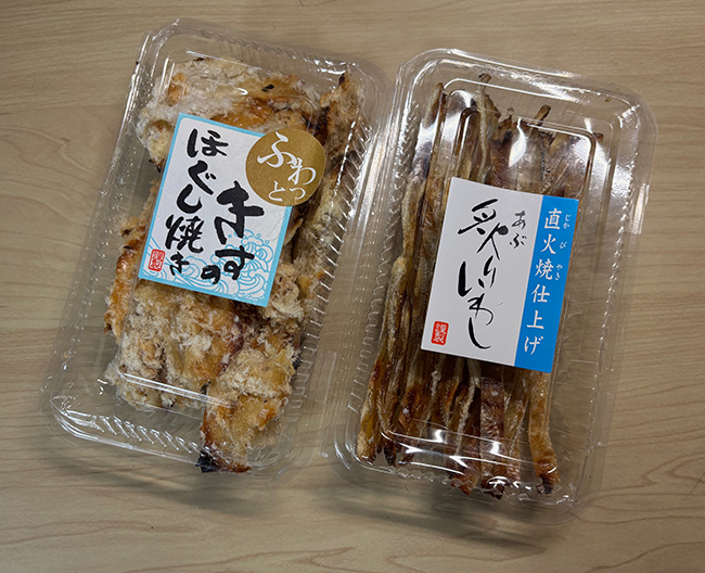 きすを直火焼きし、ほぐしをかけて食べやすくしました。炙りいわしは、いわしを丸ごと骨まで食べられるよう味付けをしてスティック状に仕上げました。