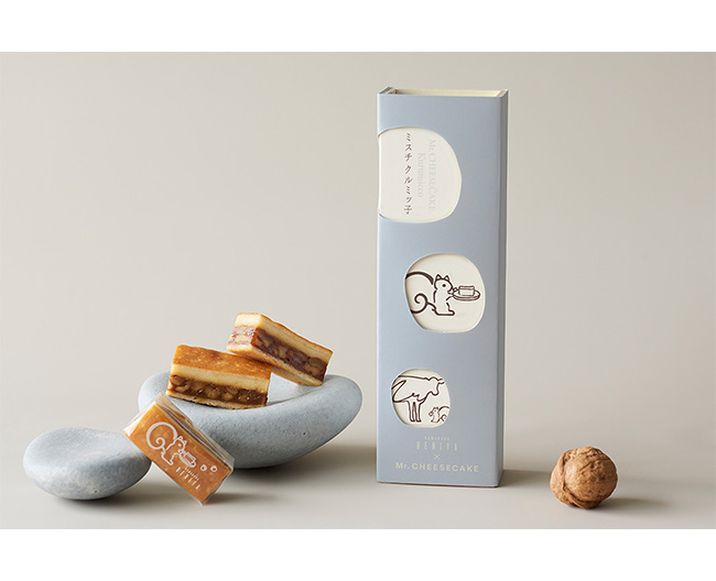 「クルミッ子」の中に「Mr. CHEESECAKE」の繊細な味わいを感じていただけるように、通常のクルミッ子のキャラメルよりキャラメルの割合を少なくし、“ミスチ クリーム“をキャラメルの層の上に塗り重ねています。どちらかに偏らない、1つのお菓子の中で「クルミッ子」と「Mr. CHEESECAKE」両方の存在を感じられる味をお楽しみください。