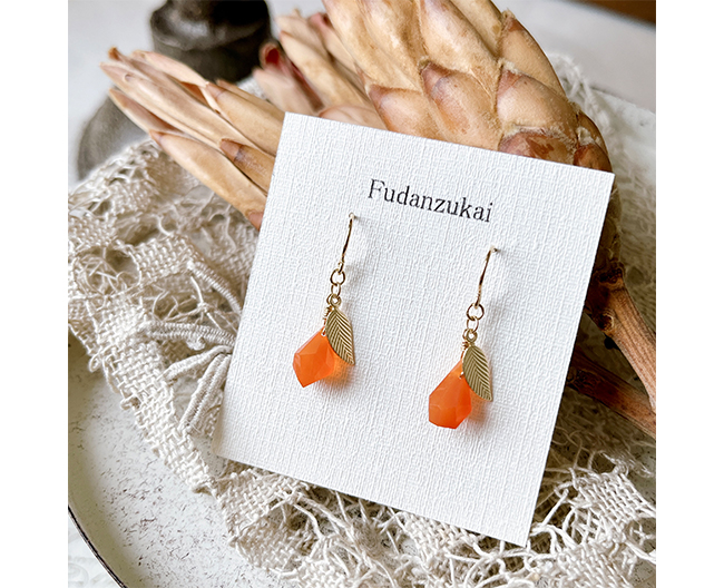 元気なオレンジ色の天然石カーネリアンに葉っぱを合わせた果物のようなかわいらしいピアスです。