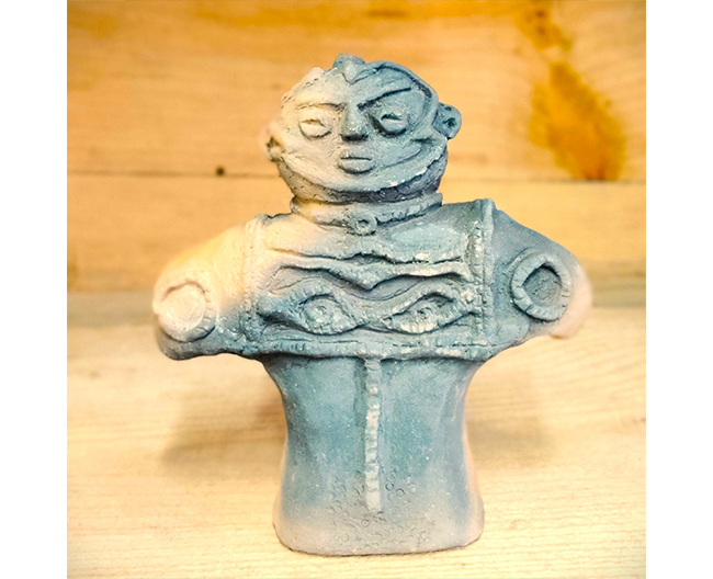 北海道の赤レンガ粘土を用いて縄文土偶「芽空」をモチーフに制作。浜辺に辿り着いた流木を用いて焼き上げました。