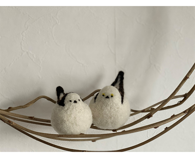 雪の妖精「シマエナガ」を模したマスコット。実際の「シマエナガ」はこちらの作品よりもっと小さくて軽いんです。