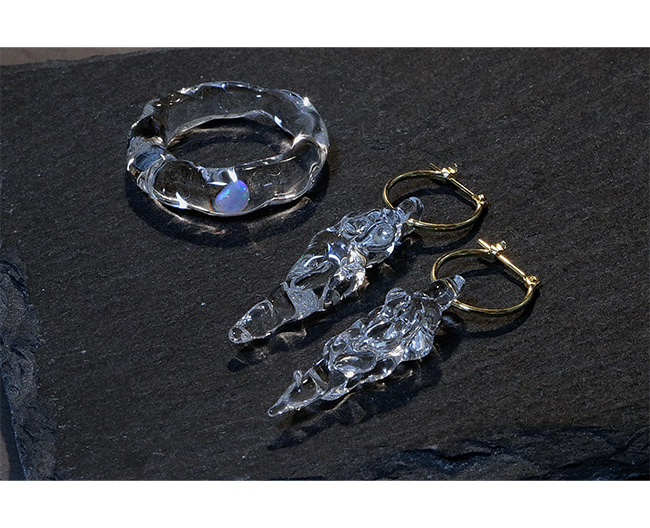 ゆるやかな水流と見紛う宝石のように透明な輝きを放つリングと、北海道の大自然を「つらら」で表現した表情豊かな凸凹が繊細にきらめくピアスです。