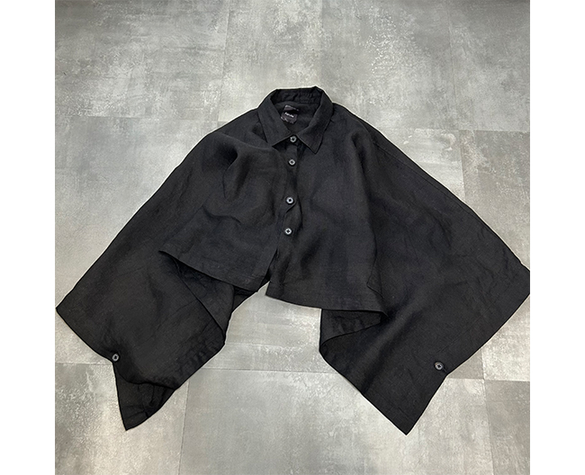 袖ぐりのボタンの取り外しによりジャケットとしても、マントのようなラインとしてもお楽しみいただける上着です。