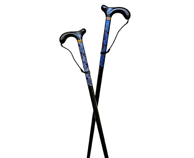 鉄媒染による深みのある色調に、柄布をあしらった装飾を施し、気品漂う仕上がりに。装いを格調高く引き立てる、軽やかで優美なステッキです。