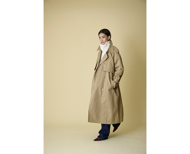 高密度に織られた、綿ツイルデッドストック素材のトレンチコート。