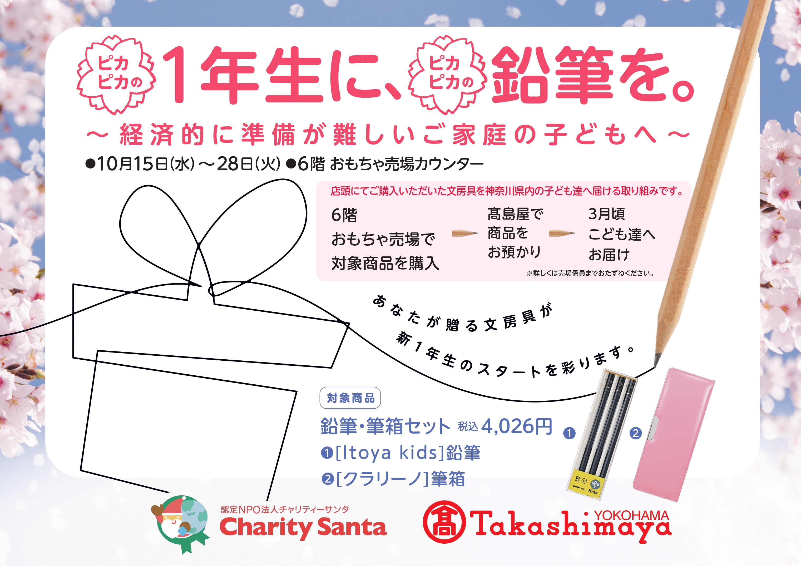 ご購入いただいた文房具セットは横浜高島屋がお預かりし、認定NPO法人チャリティーサンタを通じて、2026年2月末ごろに神奈川県内の新小学1年生へお届けいたします。