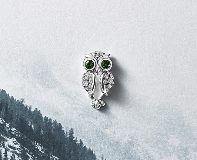 開運や知性の象徴であるフクロウをピンブローチに。グリーンガーネットで仕立てた大きい瞳が愛らしく、思わず笑みがこぼれます。