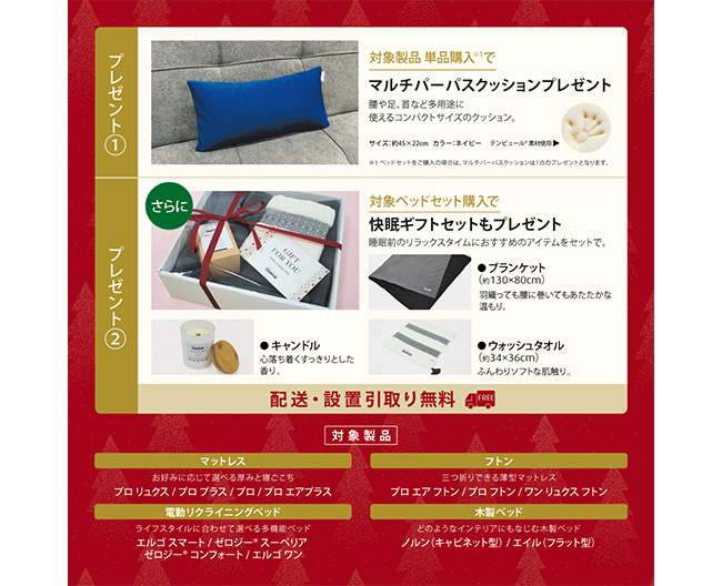 期間中、対象のマットレス・フトン・電動リクライニングベッド・木製ベッドをお買上げのお客様に、[テンピュール®] 特製の快眠アイテムを進呈いたします。