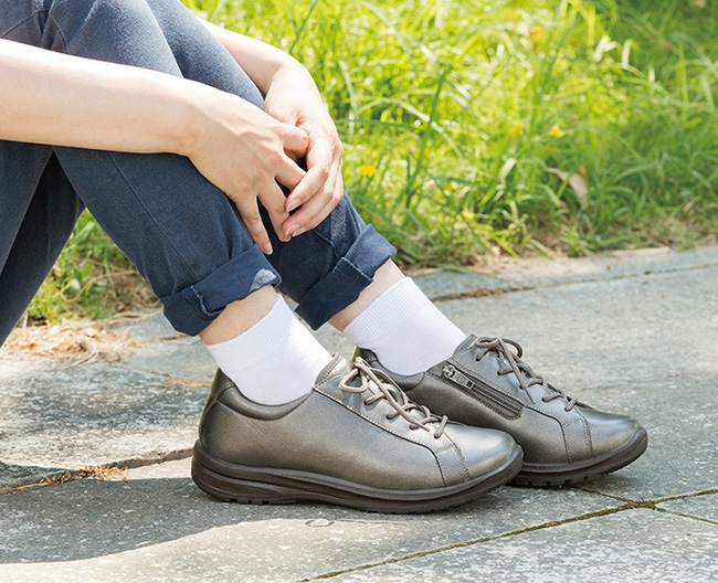 歩くとひざが痛む、長時間歩くのがつらいなどひざのトラブルにお悩みではありませんか?足の着地時にかかと裏のスクリュー部のフィンが体重圧でたわみ、つま先をやや外側へ旋回を促すことで着地の衝撃が分散され、ひざの負担を減らし安定した歩行を補助してくれます。幅広い世代の方にはいてほしい、ひざへの負担の軽さが実感できるメディカルウォークをぜひ店頭にてお試しください。