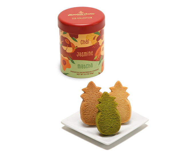 ティー・コレクション・ギフト缶には、季節限定フレーバー、チャイ、ジャスミン、抹茶が入っています。パイナップル形のクッキーは、個別包装されています。