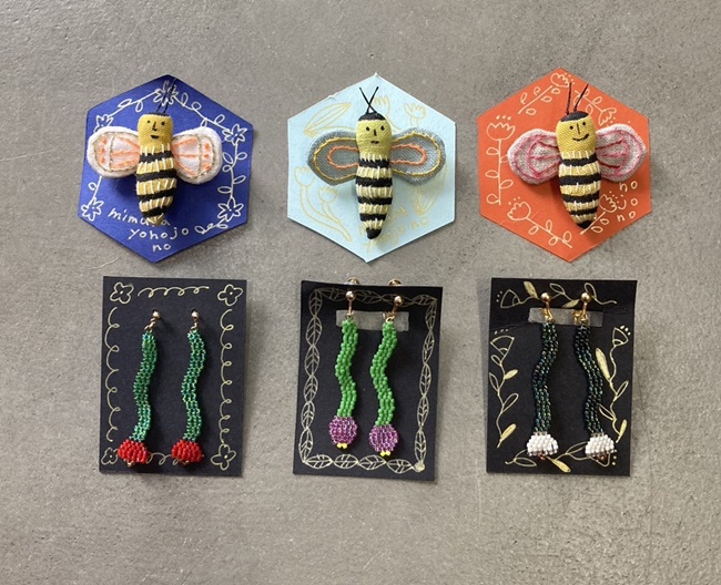 洋服から小物まで、プリントや刺繍など様々な技法を使って手作りしています。小さな布やビーズを組み合わた、ミツバチのブローチや植物モチーフのイヤーアクセサリーは、素材の風合いを生かしながら、ユーモラスで愛らしいデザインが特徴です。