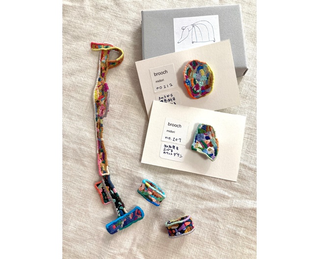 刺繍アクセサリー(ブローチ、指輪、ブレスレット)、カレンダーなどを販売します。毎回下書きはせず、絵を描くように刺繍をしているので一つ一つ形も刺繍も違います。全てに番号と本から集め選んだ言葉を合わせ、作品と観る買う人の心にきっかけを残せる作品を製作しています。